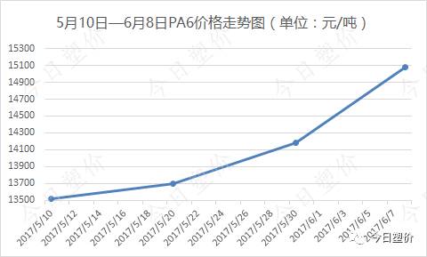 今天,PA6华东地区平均价格为15080元/吨,周涨幅为5.9%,较5月10日的13520元/吨,涨了1560元/吨,涨幅为15.4%。