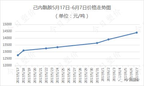 从5月17日到现在,己内酰胺涨了1650元/吨,涨幅为13%,周涨幅为5.43%,日最高涨了500元/吨,最高日涨幅为3.6%。